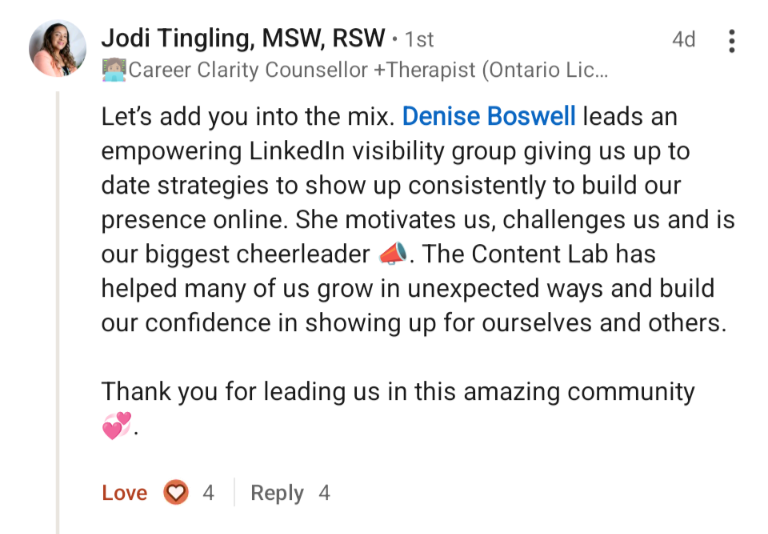 Hello, I’m Dee Boswell-Buck ~ LinkedIn Visibility Expert. I empower entrepreneurs to leverage LinkedIn for business growth. My story? I was a warehouse supervisor for a major retailer with dreams of getting into marketing. I went to night school and became certified in digital marketing. I applied for a position in the marketing department and was told to obtain more experience. So I went to LinkedIn and only posted content on what’s new in the world of marketing. Soon, entrepreneurs began to reach out and ask for help to stand out online to attract leads. Within months, I had a roster of clients and the confidence to start my own marketing business. I now help my clients to achieve consistent visibility, optimize their profiles, and book more clients with LinkedIn. As a member of Content LAB™, you can do this too!